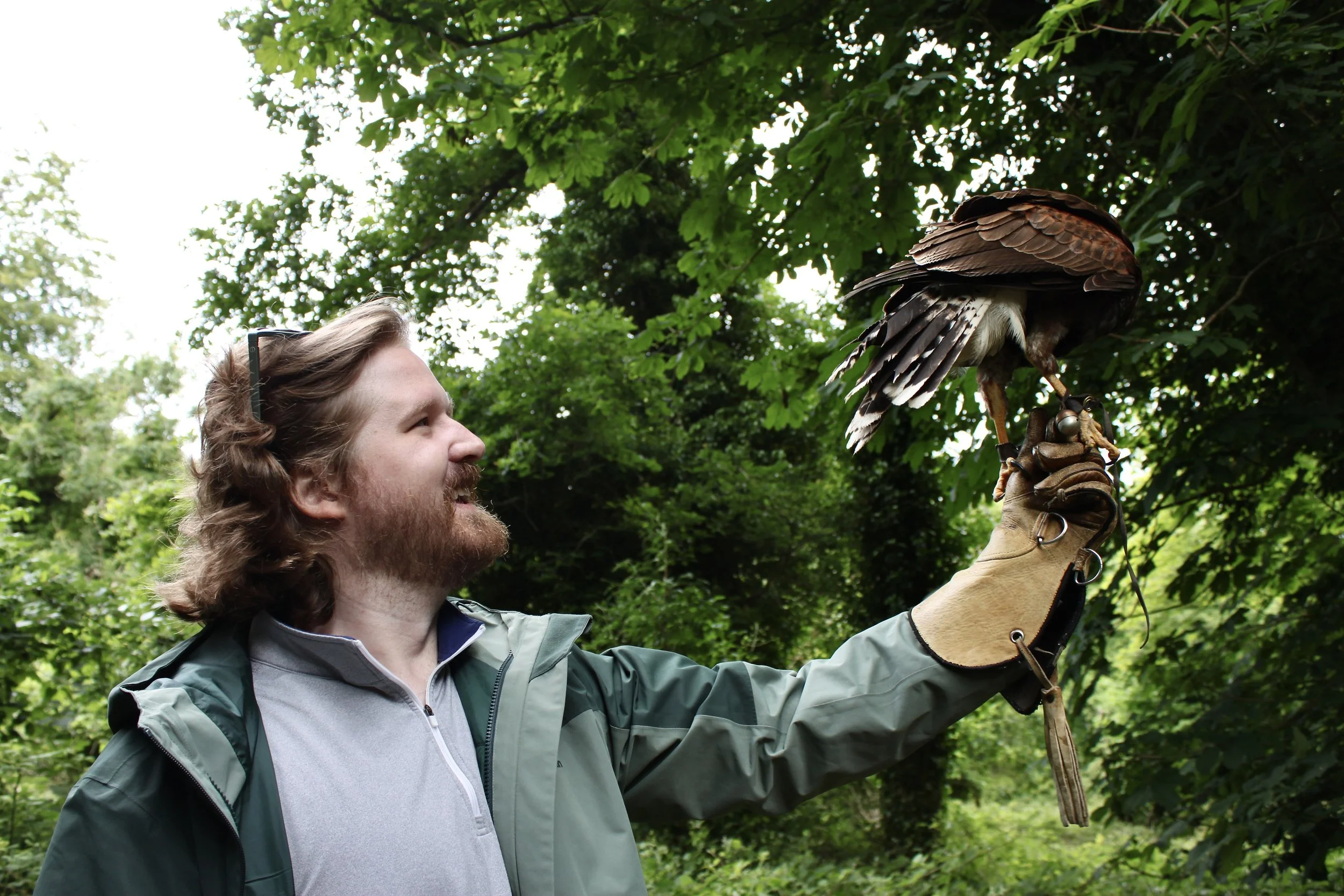 We did not have to stray far to begin our adventure, as a falconer from the Dromoland School of Falconry met us right outside the lobby’s entrance. We were able to spot him by the lovely Harris’s hawk named Aria perched on his arm! In front of the gorgeous façade of the castle, our falconer began to teach us about Harris’s hawks. He was extremely passionate not only about his job but also about hawks, and shared a ton of interesting information with us. We then each got one glove and made our way into the woodlands on the castle grounds.